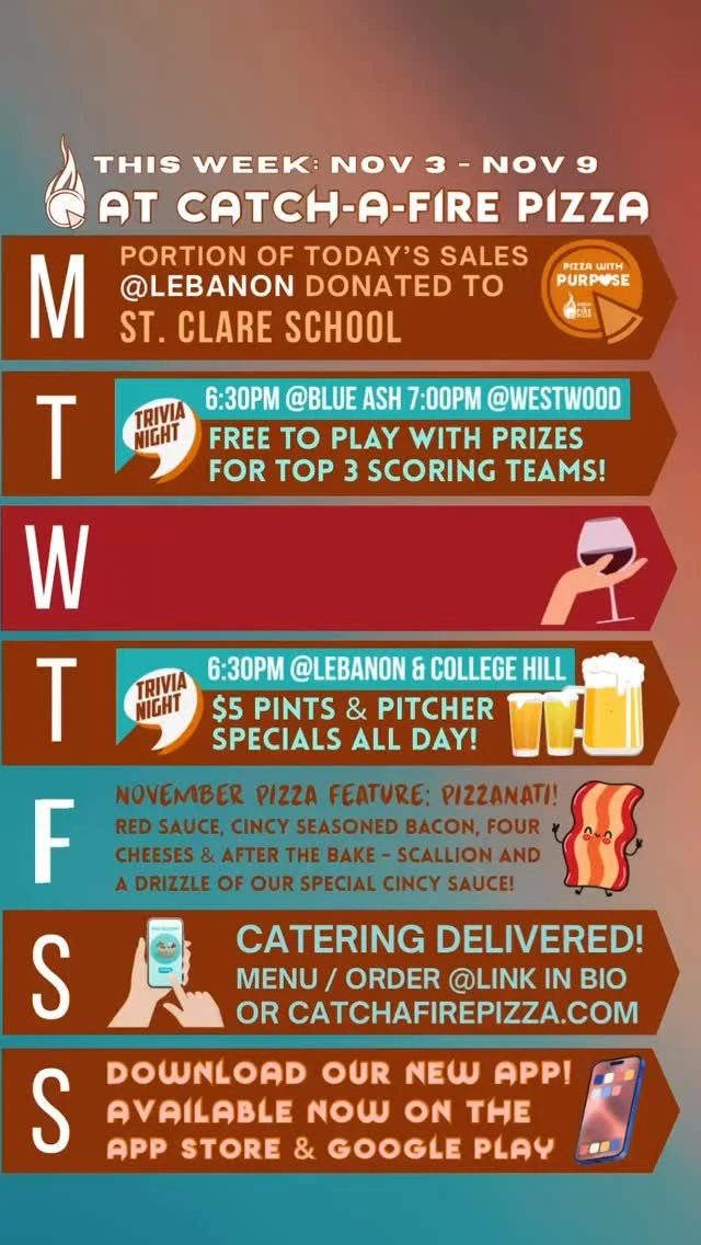 Calling all West Siders! Show your love for the famous Pizzanati Pizza at our WESTWOOD LOCATION at West Side Brewing 10/31 - 11/3! Pizzanati is topped with red sauce, Cincy seasoned bacon, four cheeses & after the bake - scallion and a drizzle of Cincy sauce! Every purchase is a vote - if we get enough votes, we'll put it back on the menu! Vote! Vote! Vote!