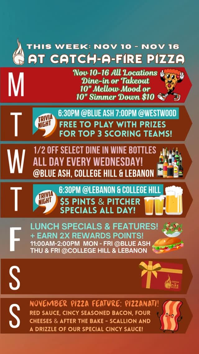 Monday - Friday at Blue Ash, Thursday & Friday at College Hill & Lebanon