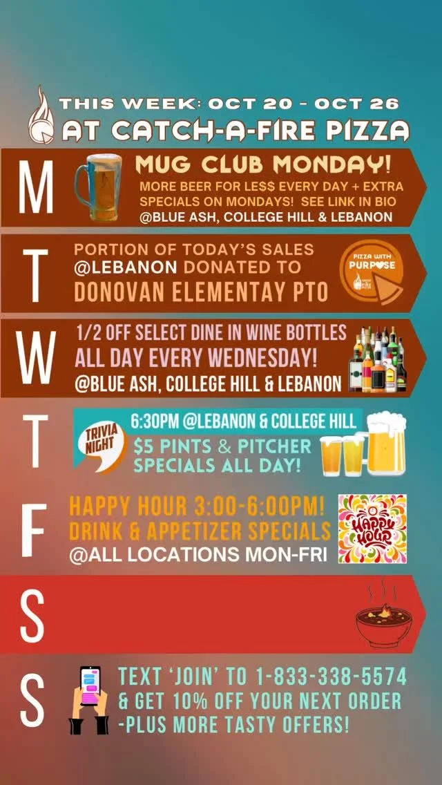 Great news! Now you can get More Beer for Le$$ at Blue Ash, College Hill & Lebanon! Unlock exclusive perks and elevate your craft beer experience with a Catch-a-Fire Pizza Mug Club membership. Memberships can be purchased at our Blue Ash, College Hill & Lebanon restaurants or ordered online and you can start enjoying your benefits today! Makes a great holiday gift for the beer lover!